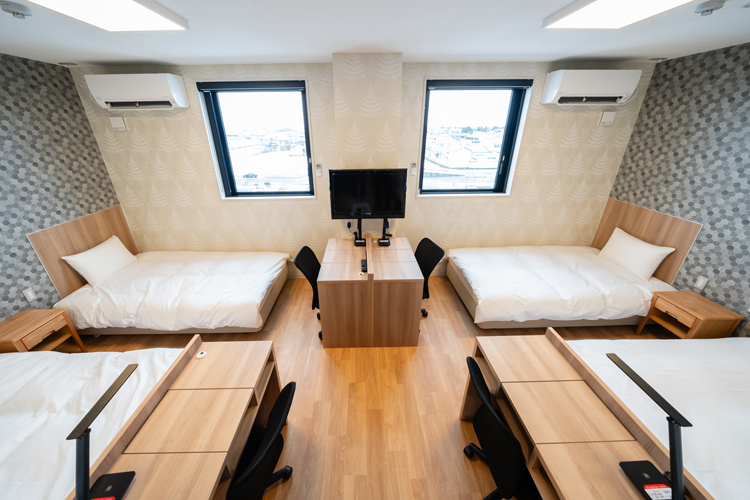 宿舎はホテルライクなデザインで、シングル・ツイン・トリプル・フォーユースの各部屋タイプを用意。全室にバス・トイレ(セパレートタイプ)、洗濯機、冷蔵庫、テレビ、Wi-Fiを完備し、プライベートな時間も充実しています。